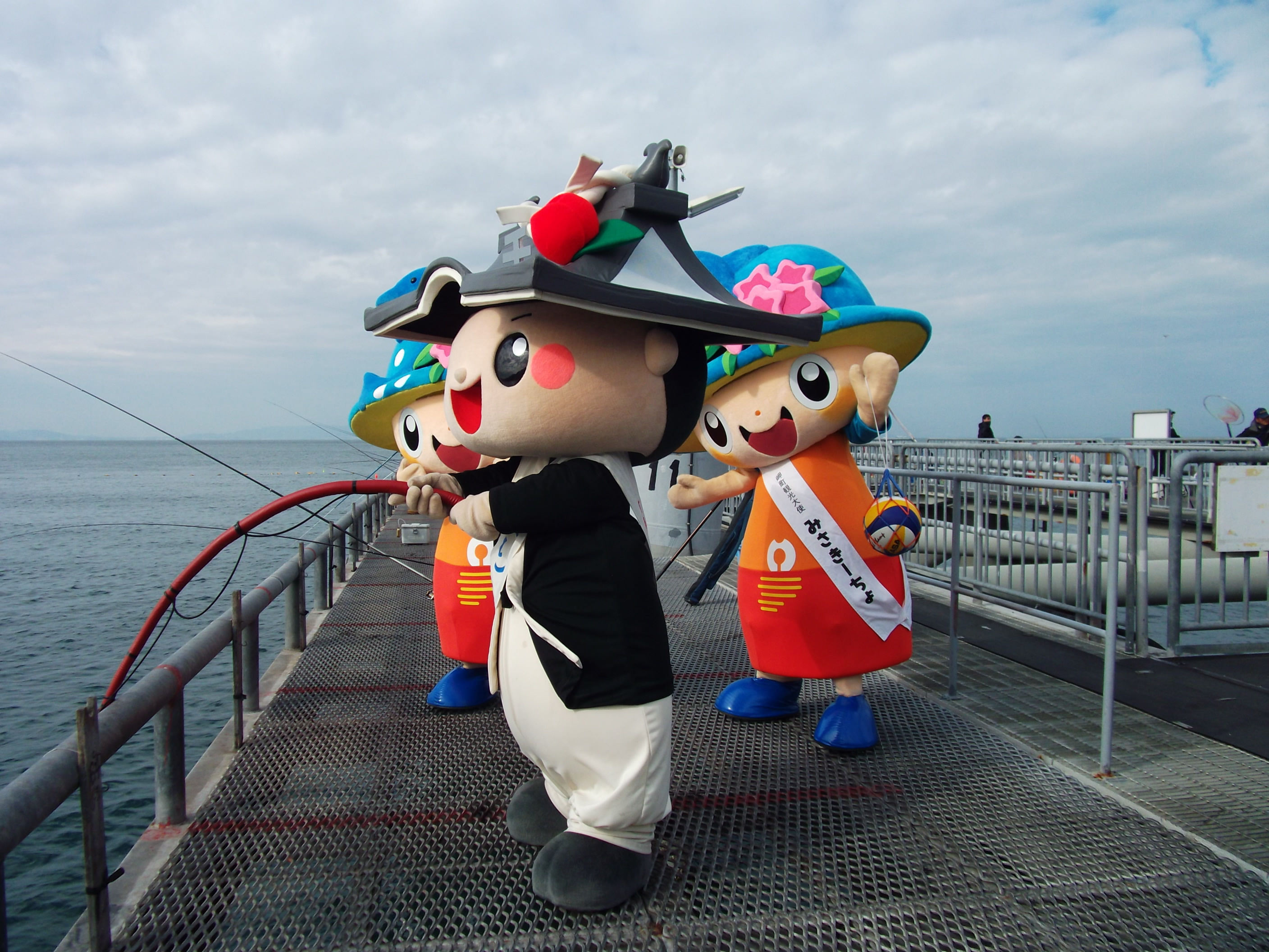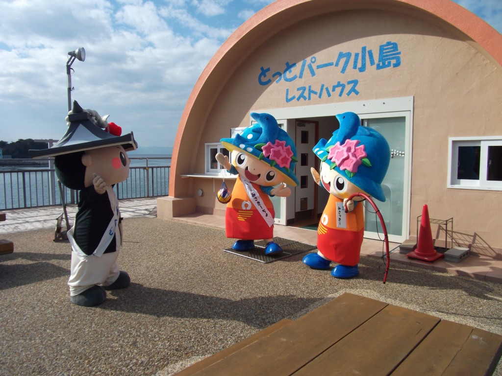 岬町のご当地キャラクター&観光大使を務めている双子の “みさっきーとみさきーちょ” と、とっとパーク小島で待ち合わせた ちきりくん。