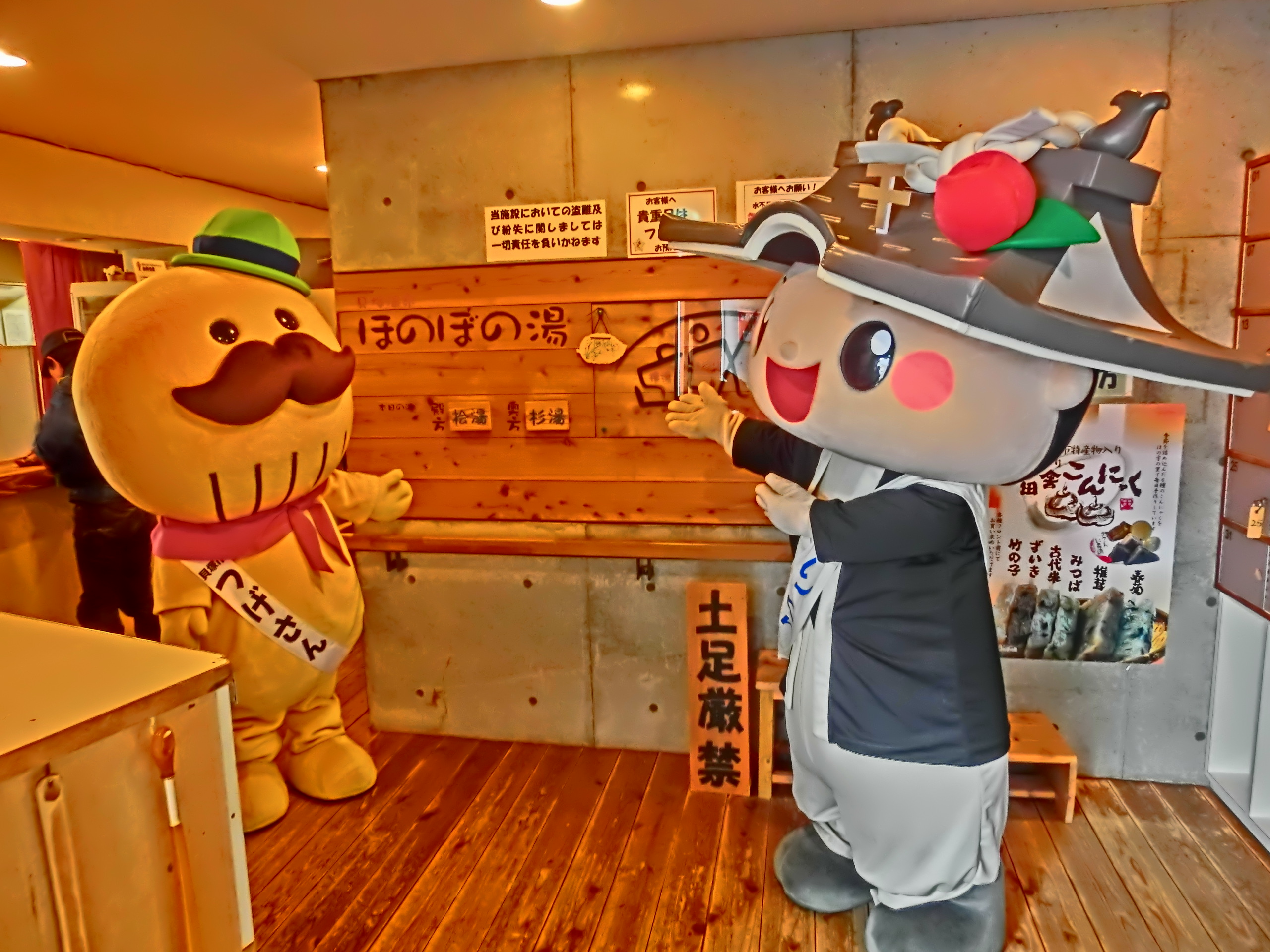 木工体験に卓球にと楽しんだ後、ナトリウム炭酸水素塩泉のアルカリ性の天然温泉 “ほのぼの湯” につかった ちきりくん。