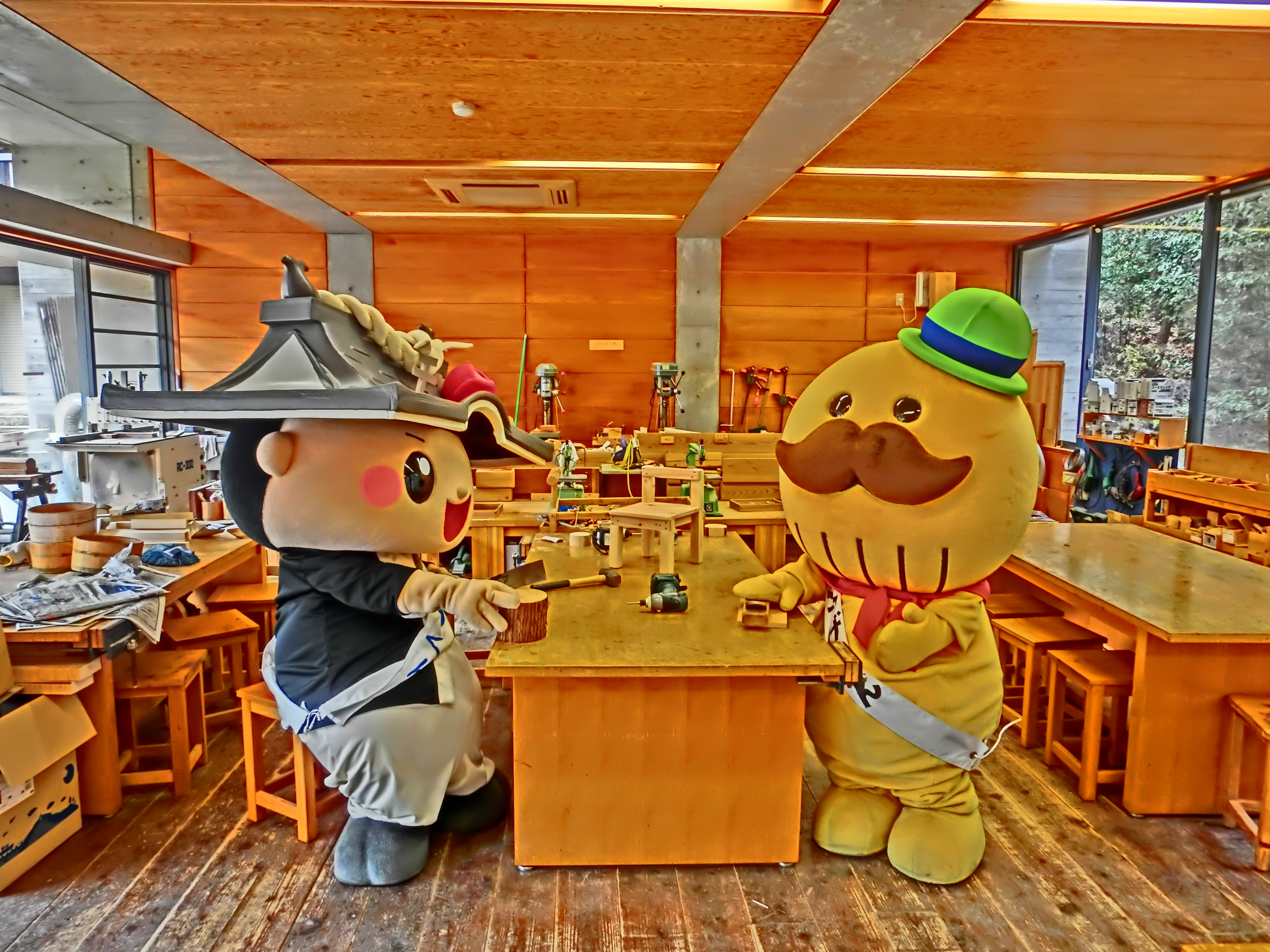 この日 貝塚市の「ほの字の里」で、貝塚市のイメージキャラクター“つげさん”と一緒に木工体験を楽しむ ちきりくん の姿が。