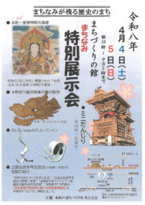 また、集会室では、だんじりの彫り物や金属アート、本町紀州街道沿いの一里塚弁財天尊像の絵画やお堂の鰐口などの関連調度品等を展示します。